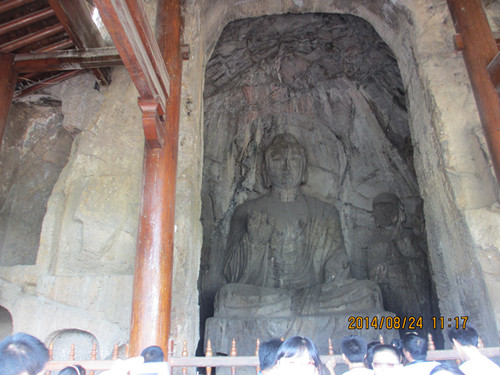 龍門(mén)山色居洛陽(yáng)八大景之冠,唐代大詩(shī)人白居易曾說(shuō):“洛都四郊,山水之勝,龍門(mén)首焉。”這里蒼峰翠嶂矗立,清澈的伊河水潺潺地流淌。走進(jìn)龍門(mén)景區(qū),恍若走進(jìn)彼岸佛國(guó)凈土。秀水青山的美麗幽靜,一下就隔絕了鬧市紅塵的喧囂,讓人如洗肺腑,放下塵緣,了絕俗念。蹬道攀坡,探頭抬眼,窟里龕上,滿(mǎn)山皆佛。小者高不盈寸,秀骨清姿,溫和親切,玲瓏精致,讓朝觀(guān)者欣欣然頓生迎佛歸心之愿。大者高達(dá)數(shù)丈,雍容大度,慈祥莊嚴(yán),氣宇非凡,令覲見(jiàn)者惶惶然往往即刻頂禮膜拜。尤其是盧舍那大佛,據(jù)說(shuō)是按當(dāng)時(shí)皇后武則天形象塑造的,佛像面圓體豐,發(fā)紋如波,月眉秀目,含笑凝視,安詳自在,宛若一位富貴;鄣闹心陭D女,令人敬而不懼。
